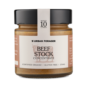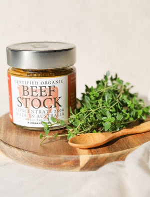 Makes 10 Liters of beef stock bursting with flavour and nutrients. Contains 100% real organic ingredients including vegetables, beef, herbs, spices, apple cider vinegar and lake salt. Add 1 tsp to 250ml of water and adjust to taste. Refrigerate after opening for up to one year.