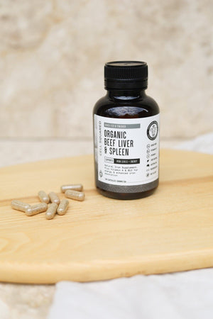 Contains Certified Organic Australian Grass-fed bovine spleen & liver (freeze dried) 84%, gelatin capsule 16%