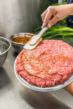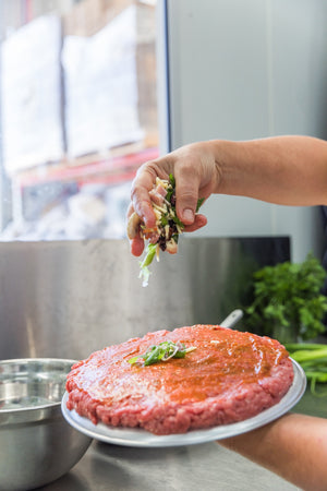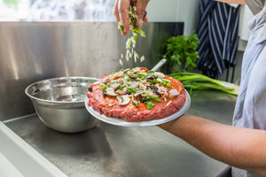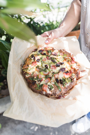 Made from a grass-fed certified organic beef mince base, seasoned with salt and pepper, we then add organic pizza sauce, and top with organic mushrooms, olives, shallots, Barambah Organic shredded cheese and our free range, chemical free bacon.