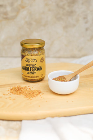 Ceres Organics Wholegrain Mustard is made with whole brown mustard seeds. With no added sugar it is great for using in cooking, adding to a sauce or when making your own dressing.