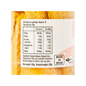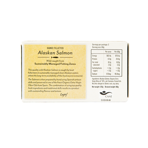 Ingredients: Alanskan salmon, Organic Extra Virgin olive Oil 35%, salt