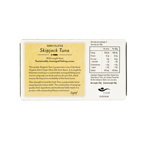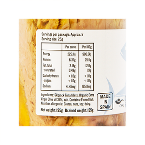 Ingredients: Skipjack Tuna Fillets, Organic Extra Virgin olive Oil 35%, salt